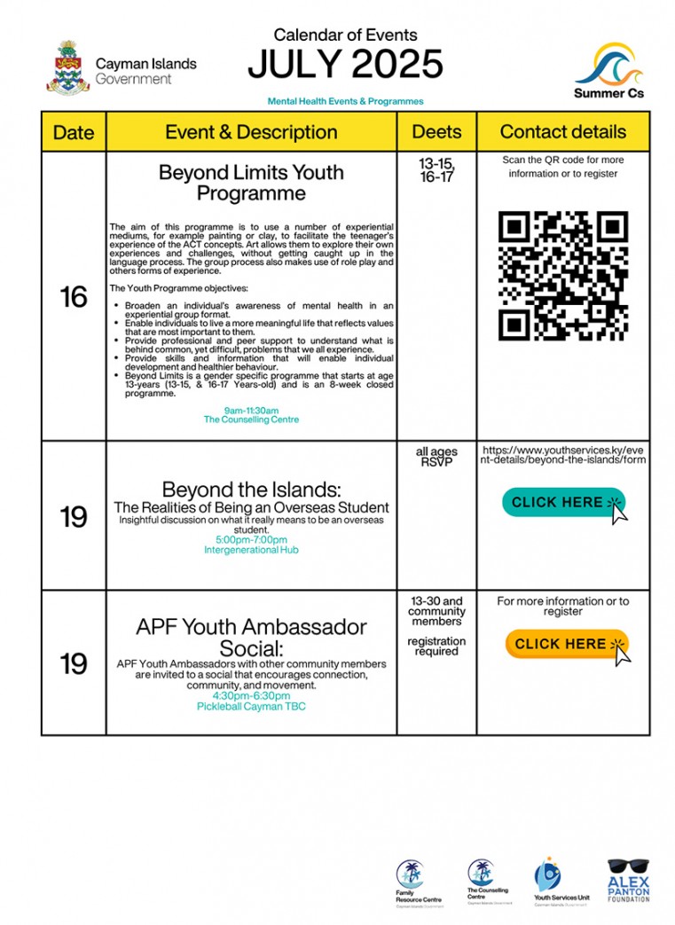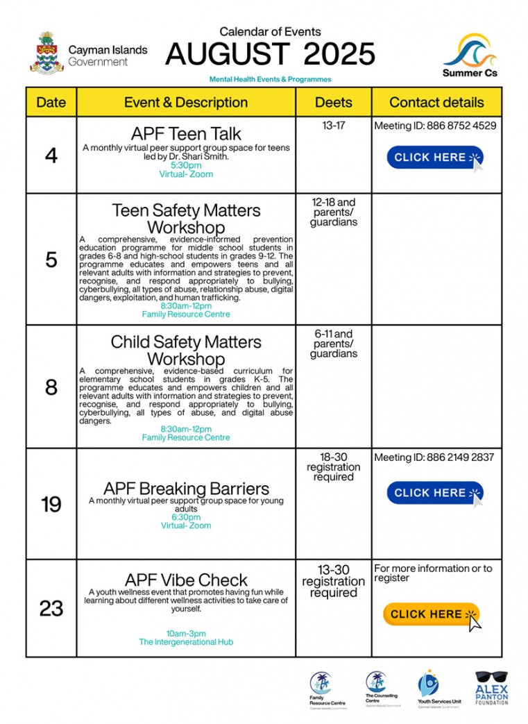Launched on 30 June 2025, the Summer Cs Campaign supports key mental health events available through the summer, that link to the needs of young people. The campaign also connects children, youth, parents and guardians to mental health services and resources available in the Cayman Islands.