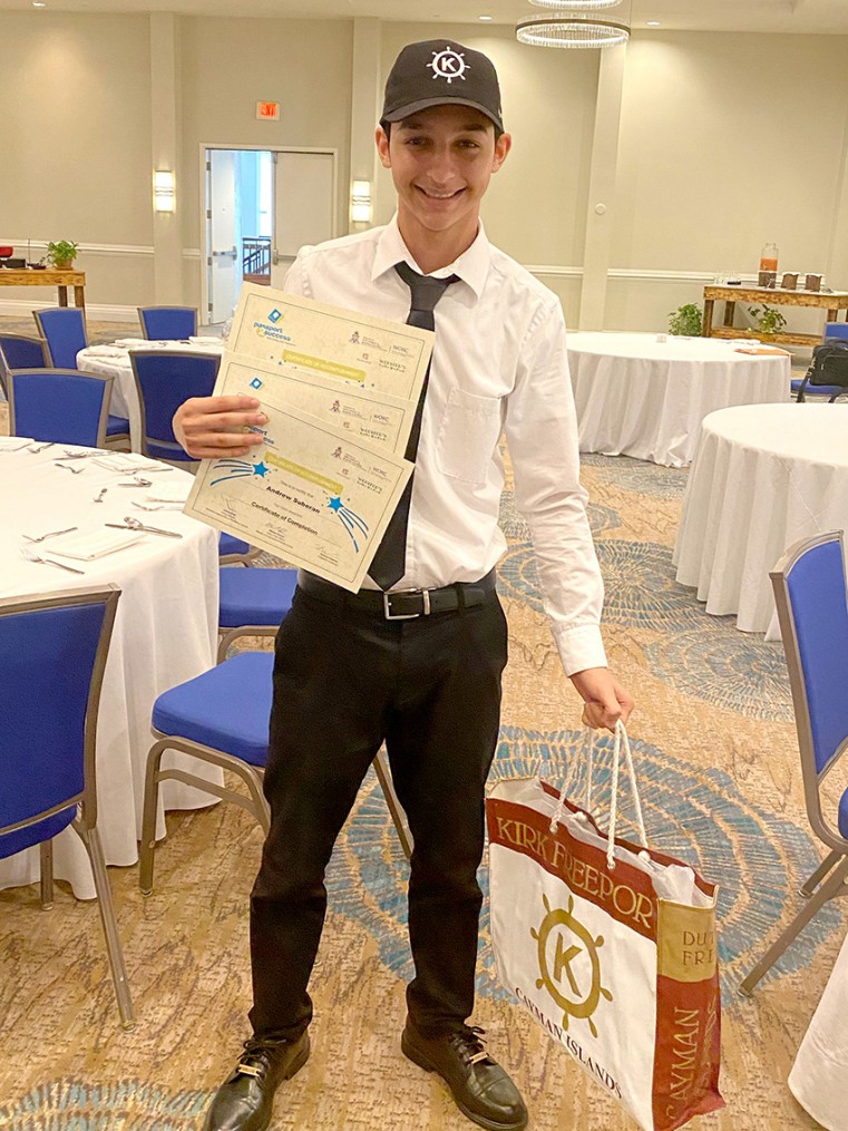Andrew Suberan with his three certificates of achievement, and wearing a hat that was included in his gift bag from Kirk Freeport