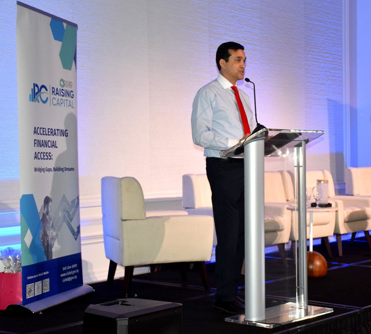 Ministry for Financial Services and Commerce Chief Officer, Dr Dax Basdeo, speaks to entrepreneurs at the Raising Capital Forum, held by the Cayman Islands Centre for Business Development.