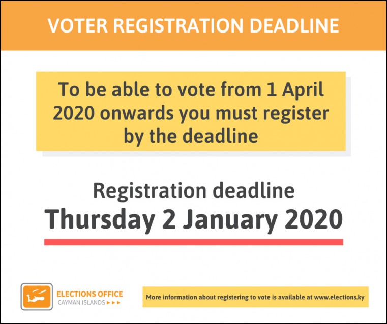 The Elections Office reminds the public that the deadline to register to vote is Thursday, 2 January 2020. Those who register by this date will be included in the register of electors and be able to vote from 1 April 2020 onwards.